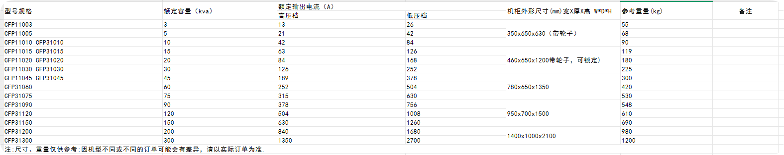 | 型號 | 額定容量 (KVA) | 額定輸出電源(A) | 機柜外形尺寸 | 備注 | |
